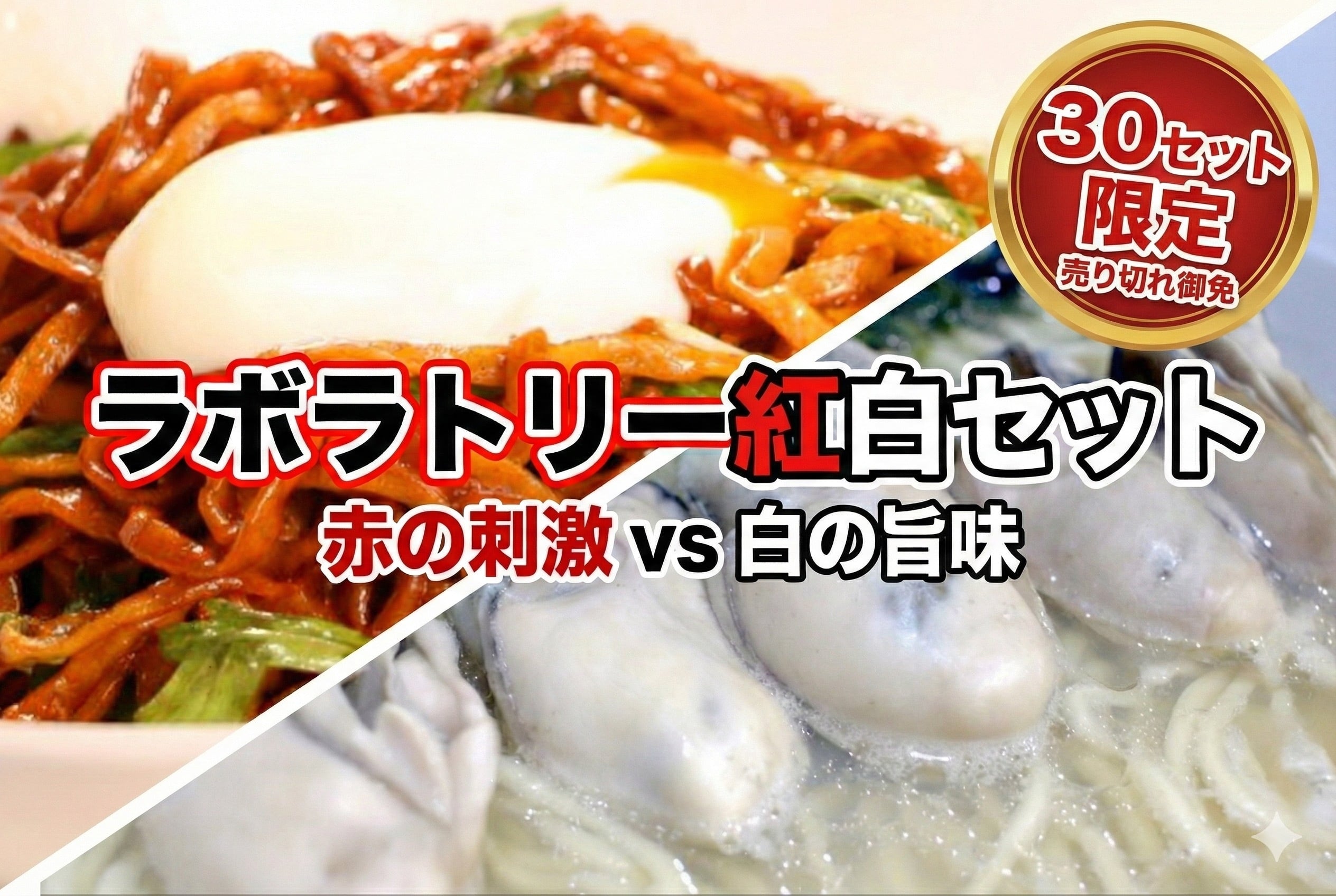 話題の「浜名湖産 牡蠣の塩そば(牡蠣3粒入り)」と、ラボラトリー不動のNo.1「汁なし担々麺(ラボタン)」を一度に楽しめる、今だけの【紅白食べ比べセット】をお得にご用意しました。