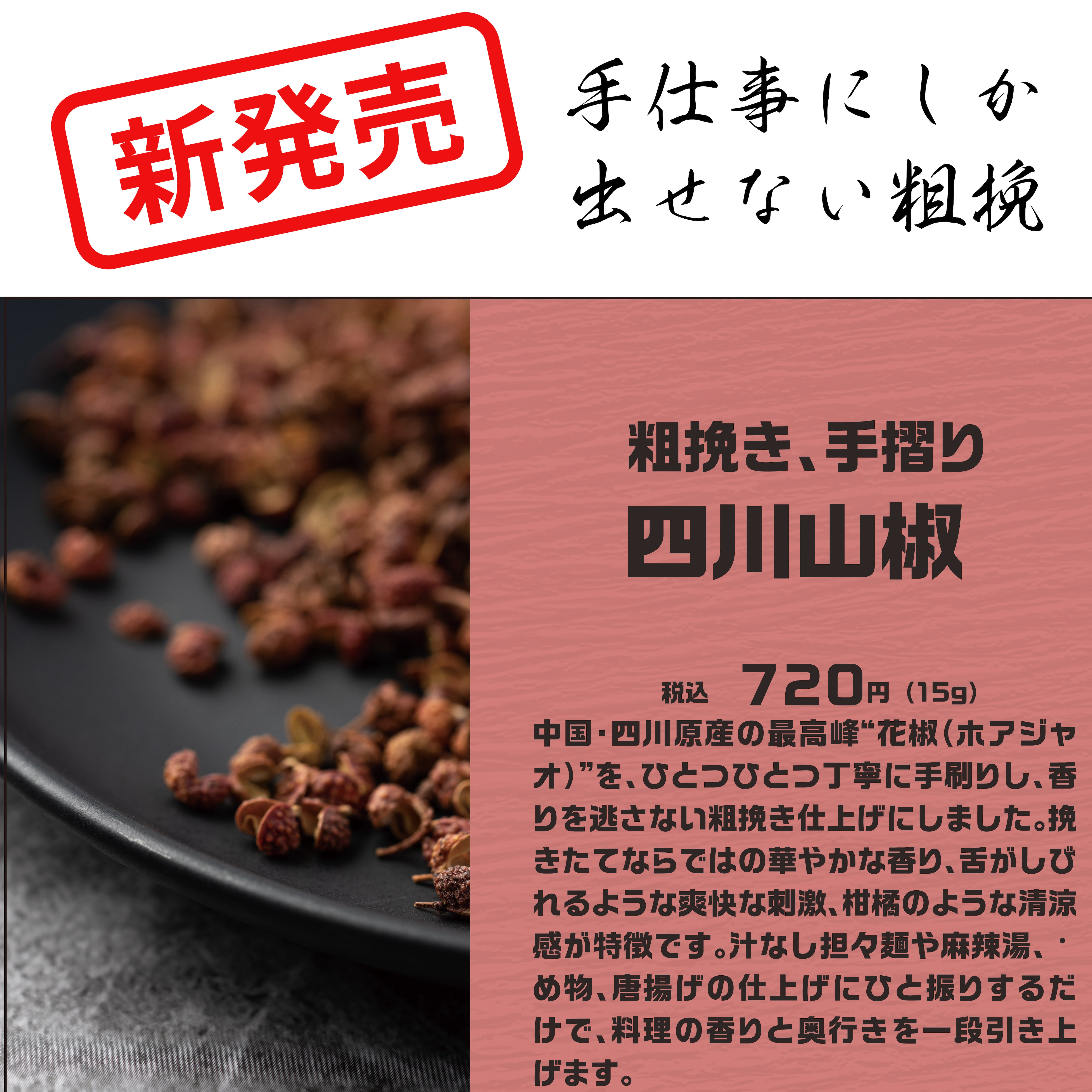 機械では再現できない、手仕事にこだわった粗挽きパウダー。挽きたての鮮烈な香りと、舌に心地よい本格的な痺れ(麻味)を追究しました。その一振りは、食卓に「本格中華の臨場感」をもたらします。