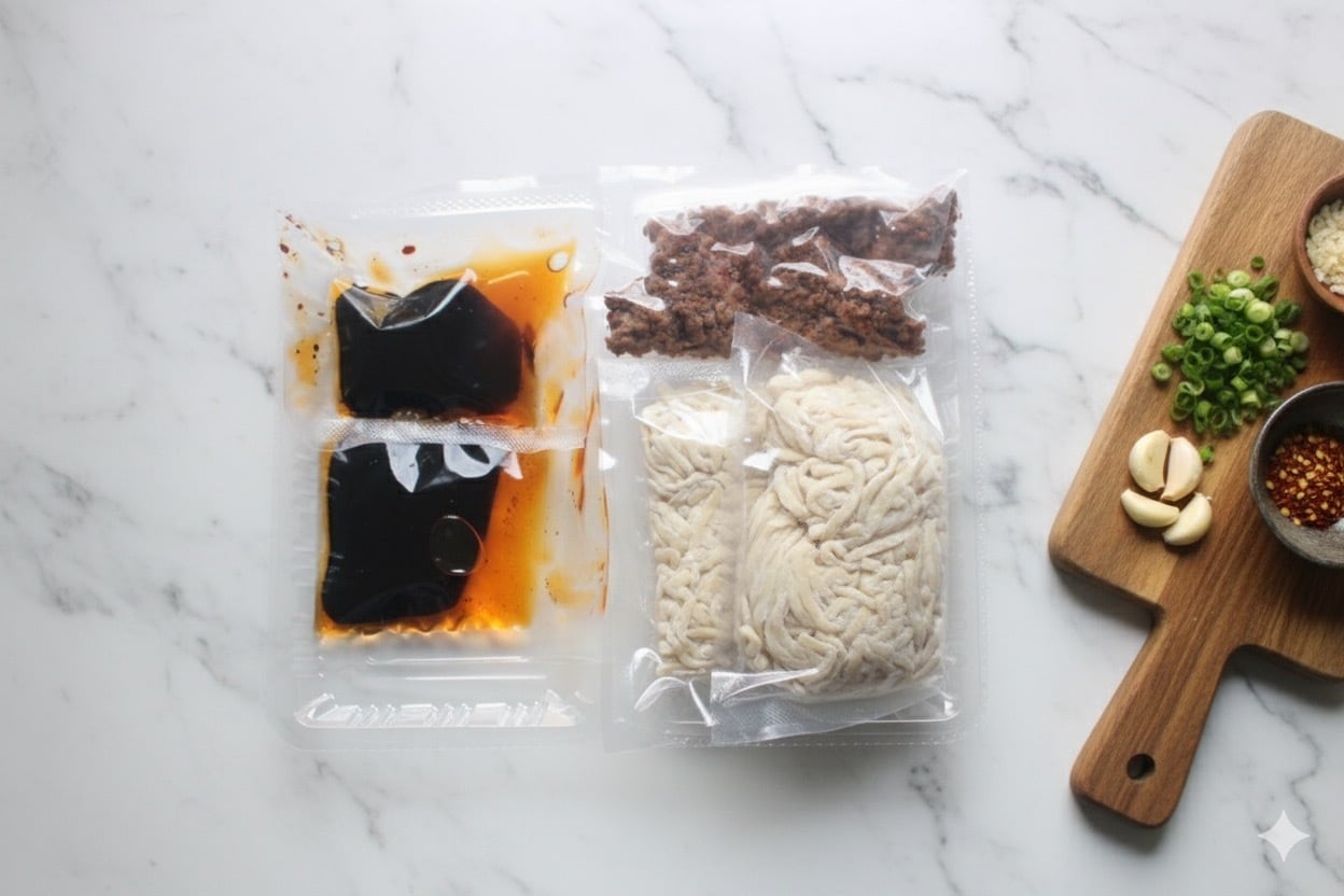 1. 特製タレと肉味噌を、熱湯もしくは、レンジで温めます。